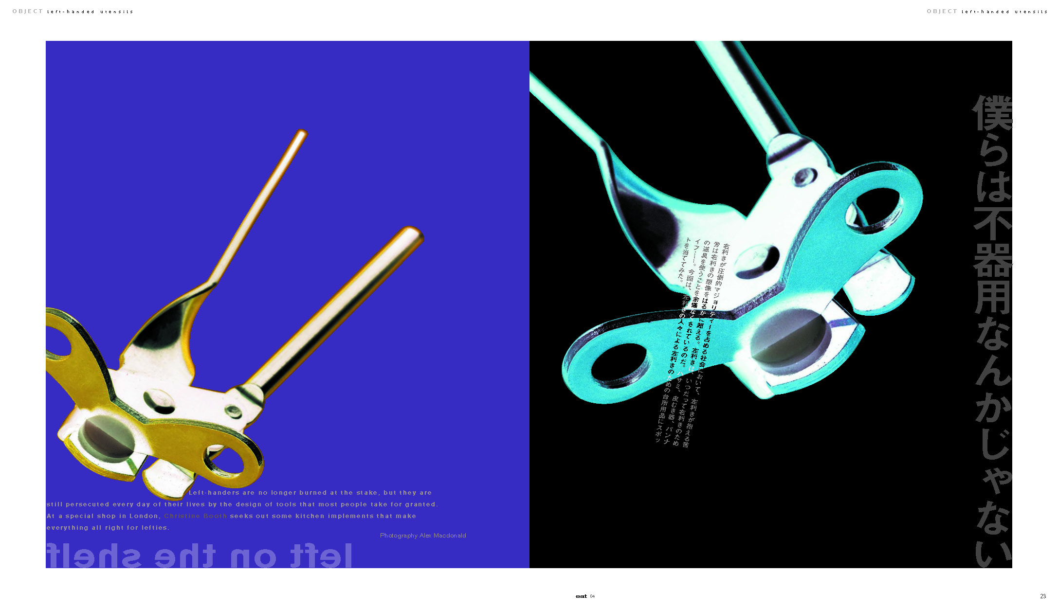 「店にまっしぐらで駆け込んで来て、わき目も振らずにペストリー用フォークに近づき、『もう我慢できない!これを1つもらうよ!』と言ったタフな男が何人いたことか、信じられないくらいですよ」。店にはまた、時計と逆周りに回すコルクの栓抜きや左利き用に注ぎ口がついたミルクパン、玉じゃくし、右側に刃のついたペストリー・スライサー、そしてそのほかにもたくさんある左利き用お役立ち製品と並んで、本格的に料理をするサウスポーのための膨大な種類の包丁が用意されている。中にはハンドルを右にも左にも回せる左右両用のハーブミルもある。右利きと左利きが共用している台所なら、これは便利だろう。