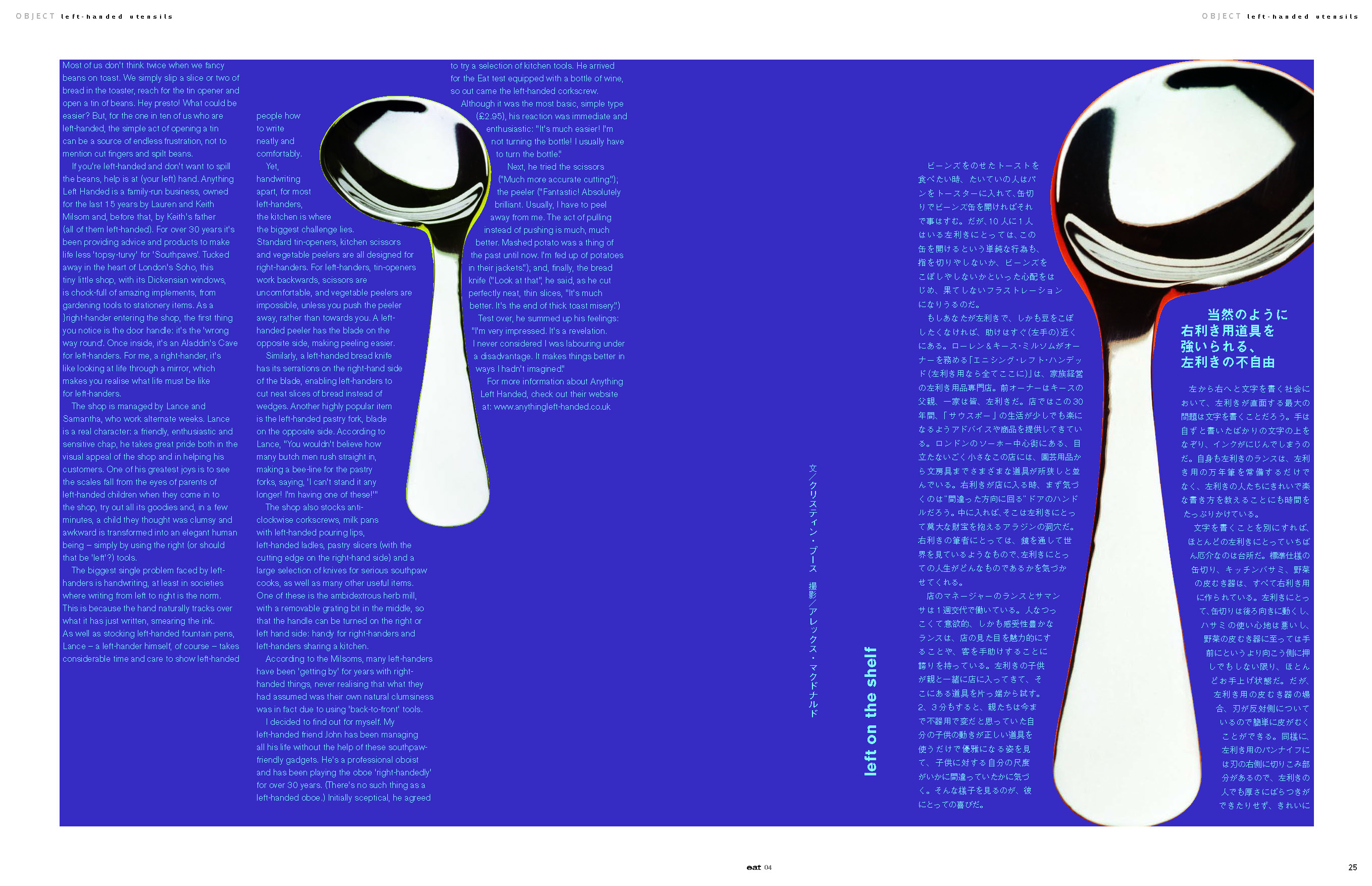 もしあなたが左利きで、しかも豆をこぼしたくなければ、助けはすぐ(左手の)近くにある。ローレン&キース・ミルソムがオーナーを務める「エニシング・レフト・ハンデッド(左利き用なら全てここに)」は、家族経営の左利き用品専門店。前オーナーはキースの父親、一家は皆、左利きだ。店ではこの30年間、「サウスポー」の生活が少しでも楽になるようアドバイスや商品を提供してきている。ロンドンのソーホー中心街にある、目立たないごく小さなこの店には、園芸用品から文房具までさまざまな道具が所狭しと並んでいる。右利きが店に入る時、まず気づくのは“間違った方向に回る”ドアのハンドルだろう。中に入れば、そこは左利きにとって莫大な財宝を抱えるアラジンの洞穴だ。右利きの筆者にとっては、鏡を通して世界を見ているようなもので、左利きにとっての人生がどんなものであるかを気づかせてくれる。