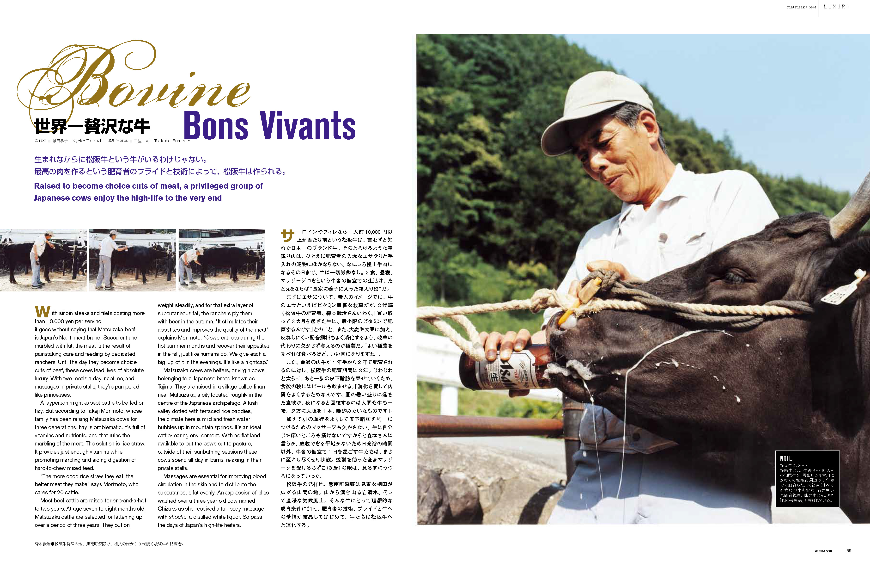 Matsuzaka cows are heifers, or virgin cows, belonging to a Japanese breed known as Tajima. They are raised in a village called Iinan near Matsuzaka, a city located roughly in the centre of the Japanese archipelago. A lush valley dotted with terraced rice paddies, the climate here is mild and fresh water bubbles up in mountain springs. It’s an ideal cattle-rearing environment. With no flat land available to put the cows out to pasture, outside of their sunbathing sessions these cows spend all day in barns, relaxing in their private stalls.