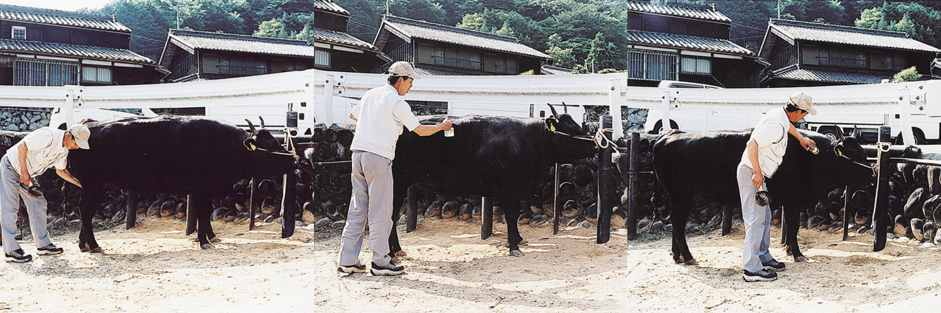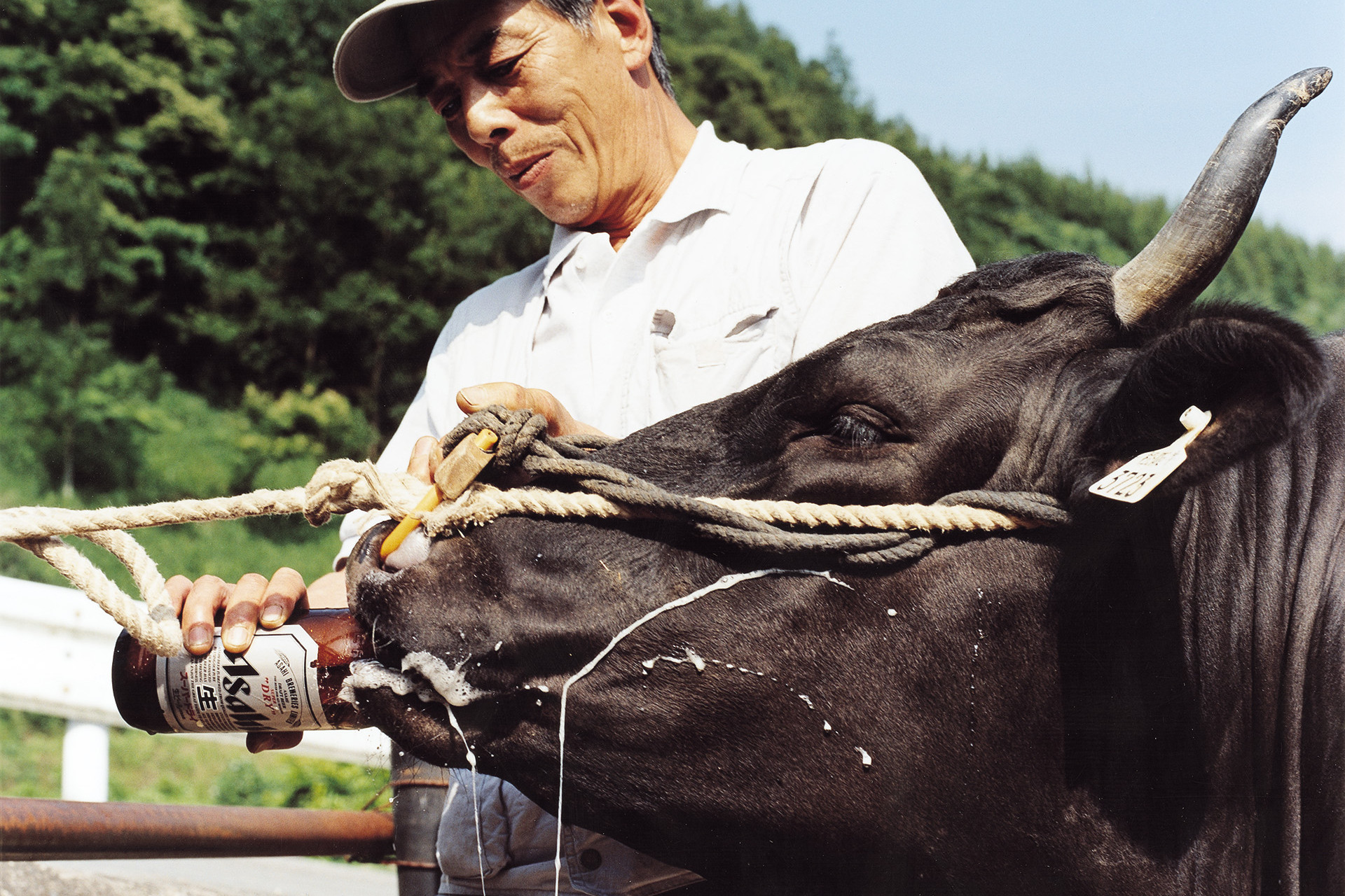 Most beef cattle are raised for one-and-a-half to two years. At age seven to eight months old, Matsuzaka cattle are selected for fattening up over a period of three years. They put on weight steadily, and for that extra layer of subcutaneous fat, the ranchers ply them with beer in the autumn. “It stimulates their appetites and improves the quality of the meat,” explains Morimoto. “Cows eat less during the hot summer months and recover their appetites in the fall, just like humans do. We give each a big jug of it in the evenings. It’s like a nightcap.”