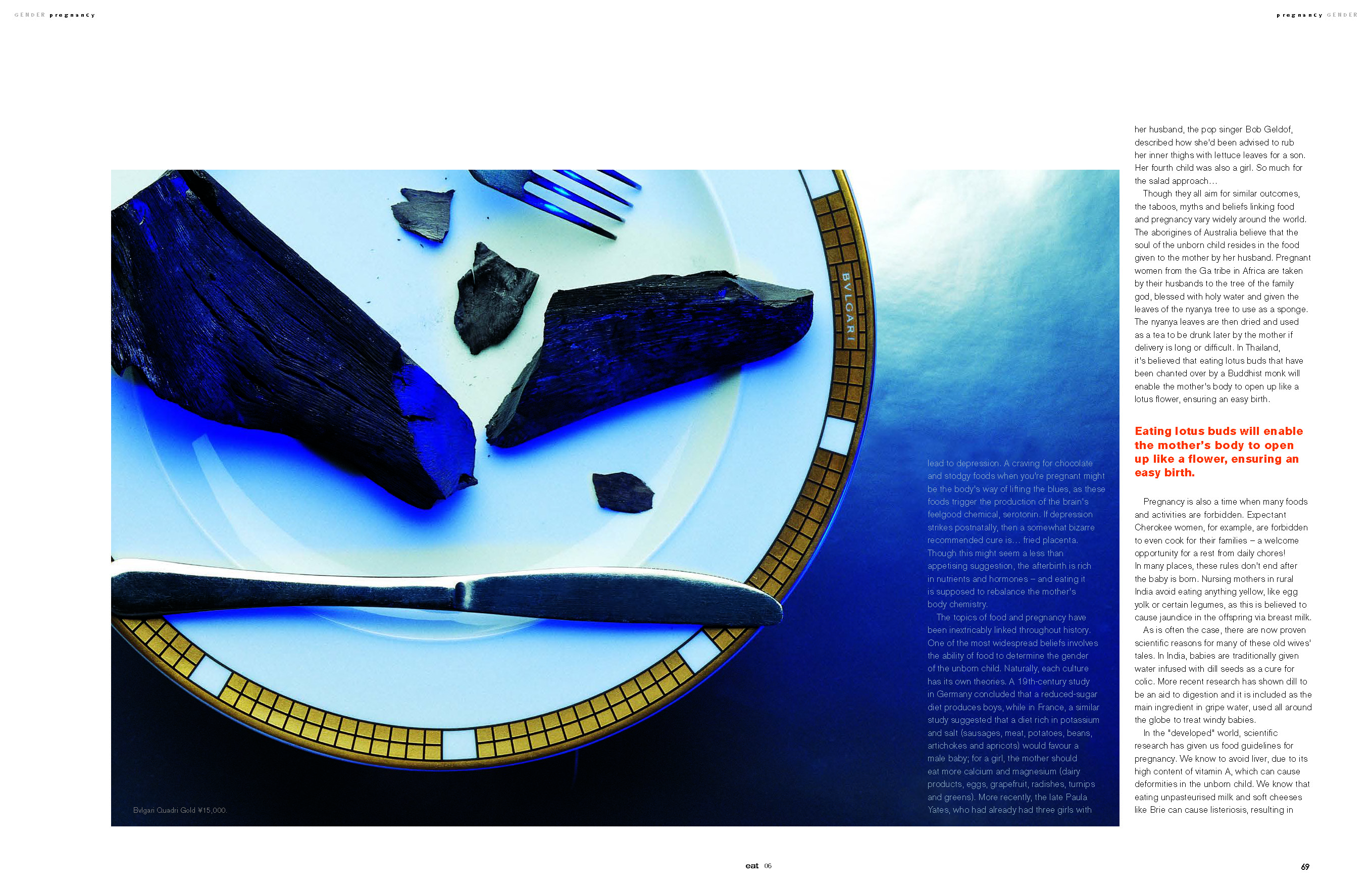 The topics of food and pregnancy have been inextricably linked throughout history. One of the most widespread beliefs involves the ability of food to determine the gender of the unborn child. Naturally, each culture has its own theories. A 19th-century study in Germany concluded that a reduced-sugar diet produces boys, while in France, a similar study suggested that a diet rich in potassium and salt (sausages, meat, potatoes, beans, artichokes and apricots) would favour a male baby; for a girl, the mother should eat more calcium and magnesium (dairy products, eggs, grapefruit, radishes, turnips and greens). More recently, the late Paula Yates, who had already had three girls with her husband, the pop singer Bob Geldof, described how she’d been advised to rub her inner thighs with lettuce leaves for a son. Her fourth child was also a girl. So much for the salad approach…